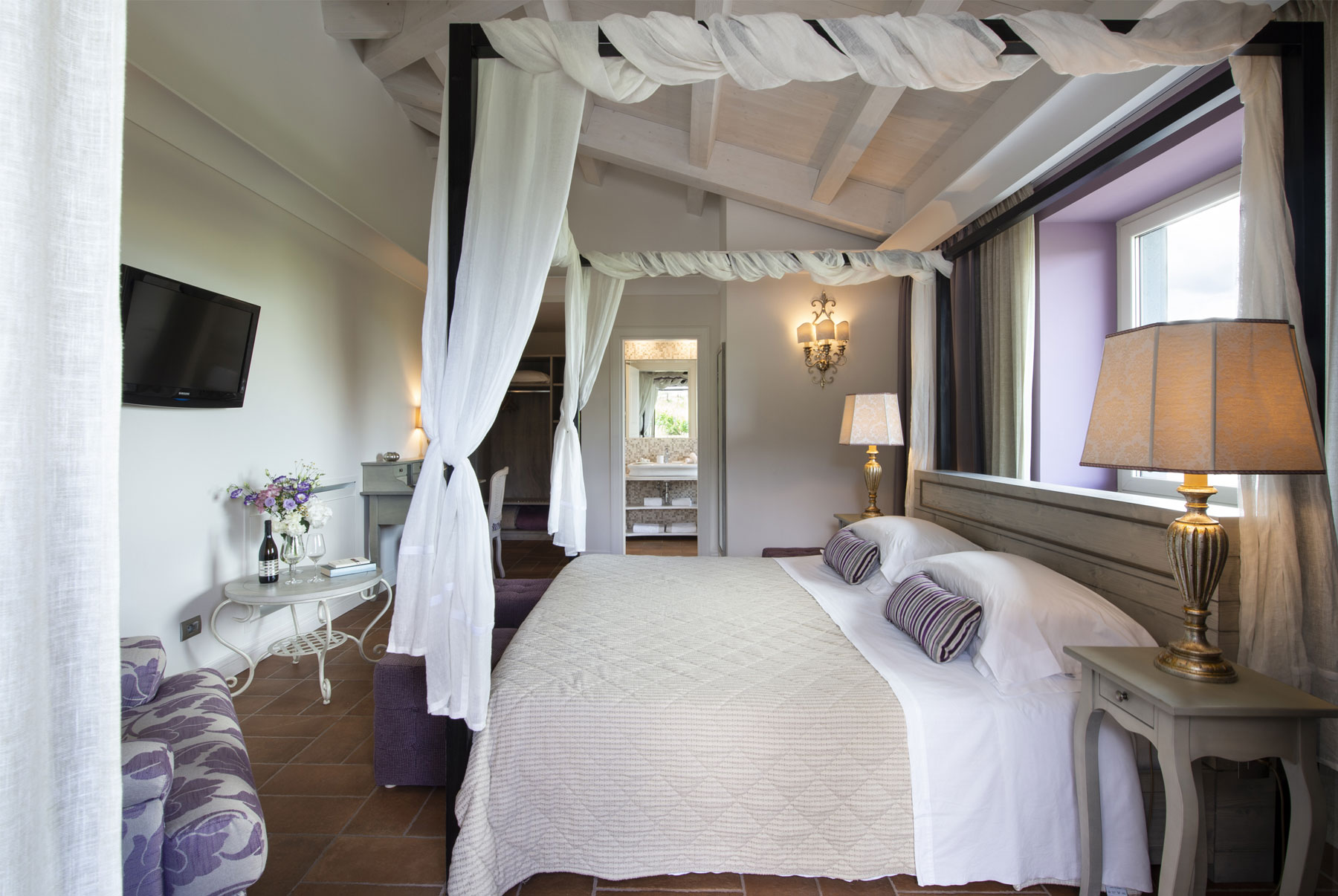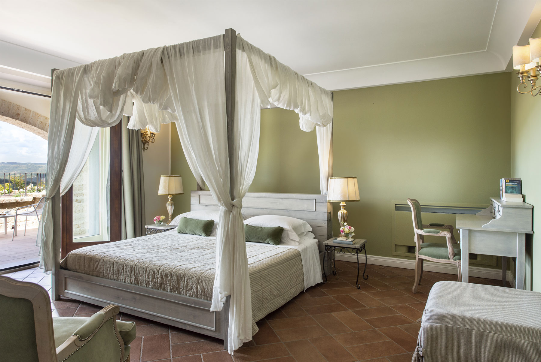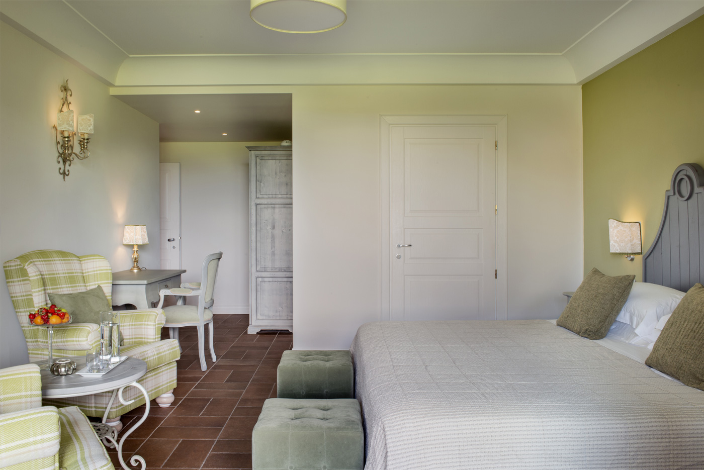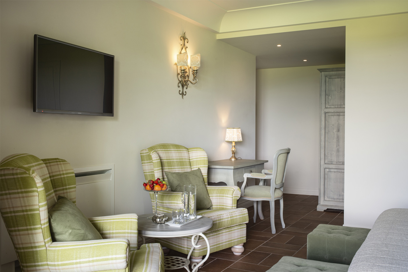 Located in Villa Gualtieri, every detail of the Suite will stimulate your romantic urges. Terracotta flooring, some with bleached wooden beams, a comfortable King-size bed and a modern, bright bathroom with a large, high pressure, rainfall shower head. A living room corner with a flat-screen TV set, a safe, a mini-bar and a corner for tea. All of the Suites include a scenic, private patio with outdoor furniture. One of the Suites is accessible for individuals with a disability.