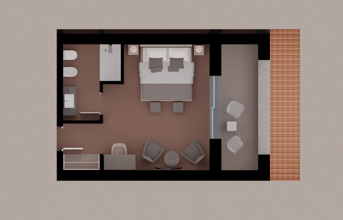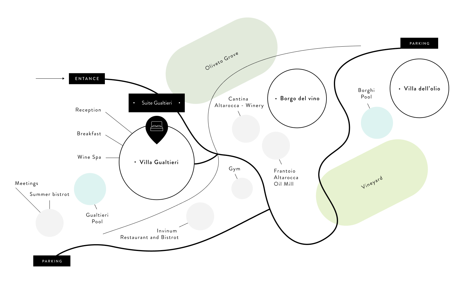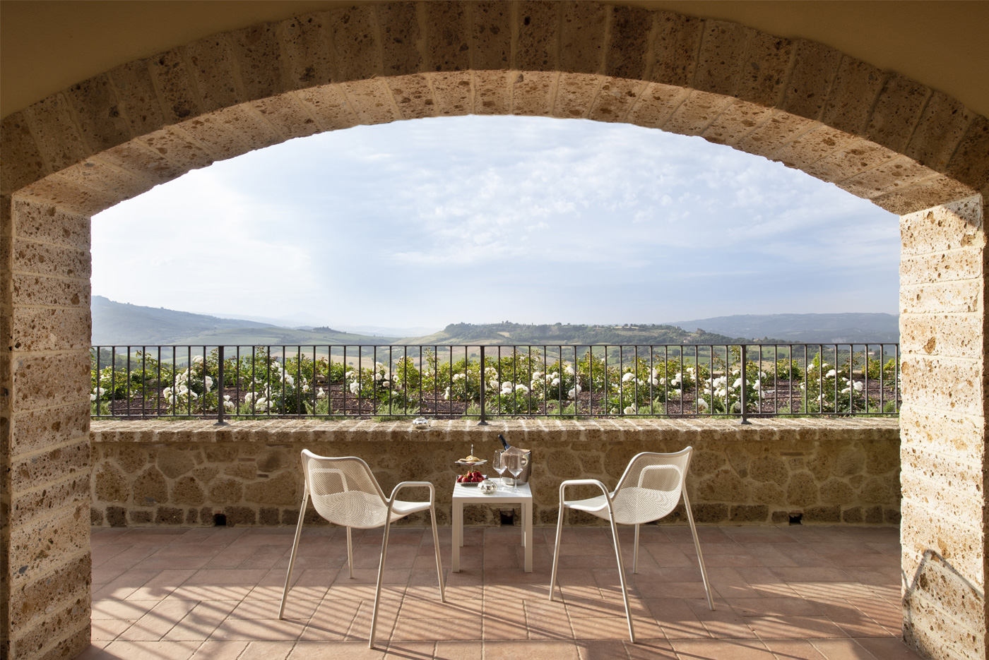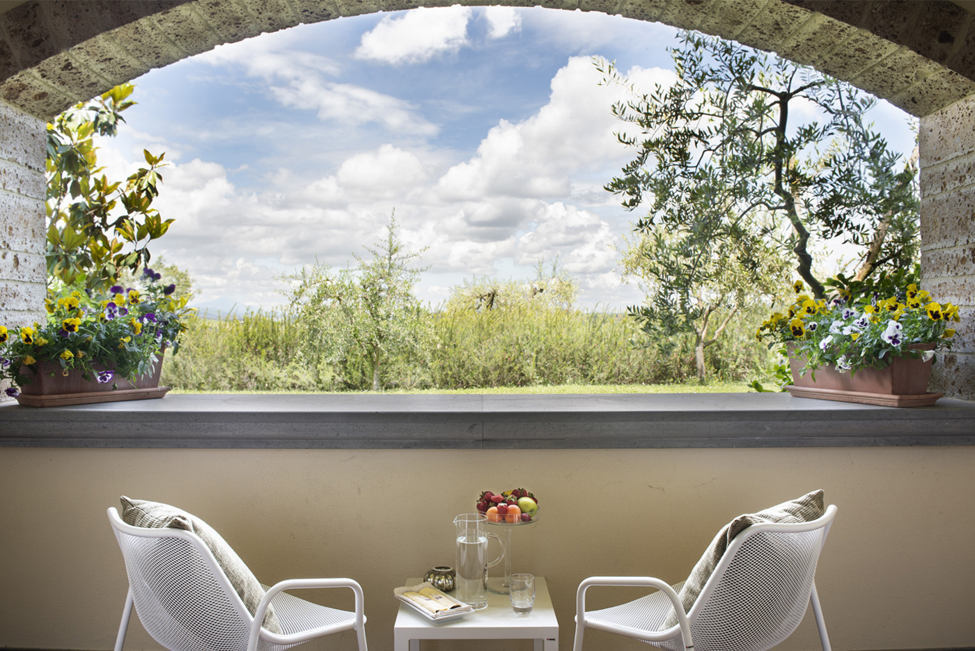 Located in Villa Gualtieri, every detail of the Suite will stimulate your romantic urges. Terracotta flooring, some with bleached wooden beams, a comfortable King-size bed and a modern, bright bathroom with a large, high pressure, rainfall shower head. A living room corner with a flat-screen TV set, a safe, a mini-bar and a corner for tea. All of the Suites include a scenic, private patio with outdoor furniture. One of the Suites is accessible for individuals with a disability.