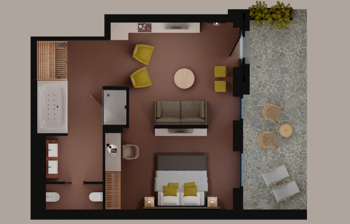 overlooking the beautiful Borghi pool. You will be transported into the most extreme sensation of relaxation by the vapors of the Turkish Bath, the sauna’s regenerating dry heat, and the invigorating waters of the hydromassage for two in an entirely private, exclusive dimension. Surrounded by vineyards, olive groves, and medicinal herbs, each suite has a private patio with an outdoor table and chairs. They are furnished with warm colors on the walls and soft curtains that offer a glimpse of the view. The stylish rooms include a terracotta floor, a large bedroom with a welcoming King-size bed and a flat-screen tv; a spacious, modern bathroom in mosaic with chromotherapy, hairdryer, organic courtesy set, soft terrycloth bathrobes, and courtesy slippers. A large living room area with a queen-size sofa bed, a second flat-screen TV, a desk, a safe with an electronic combination, a minibar, and a tea corner complete the Executive Wellness Suite.