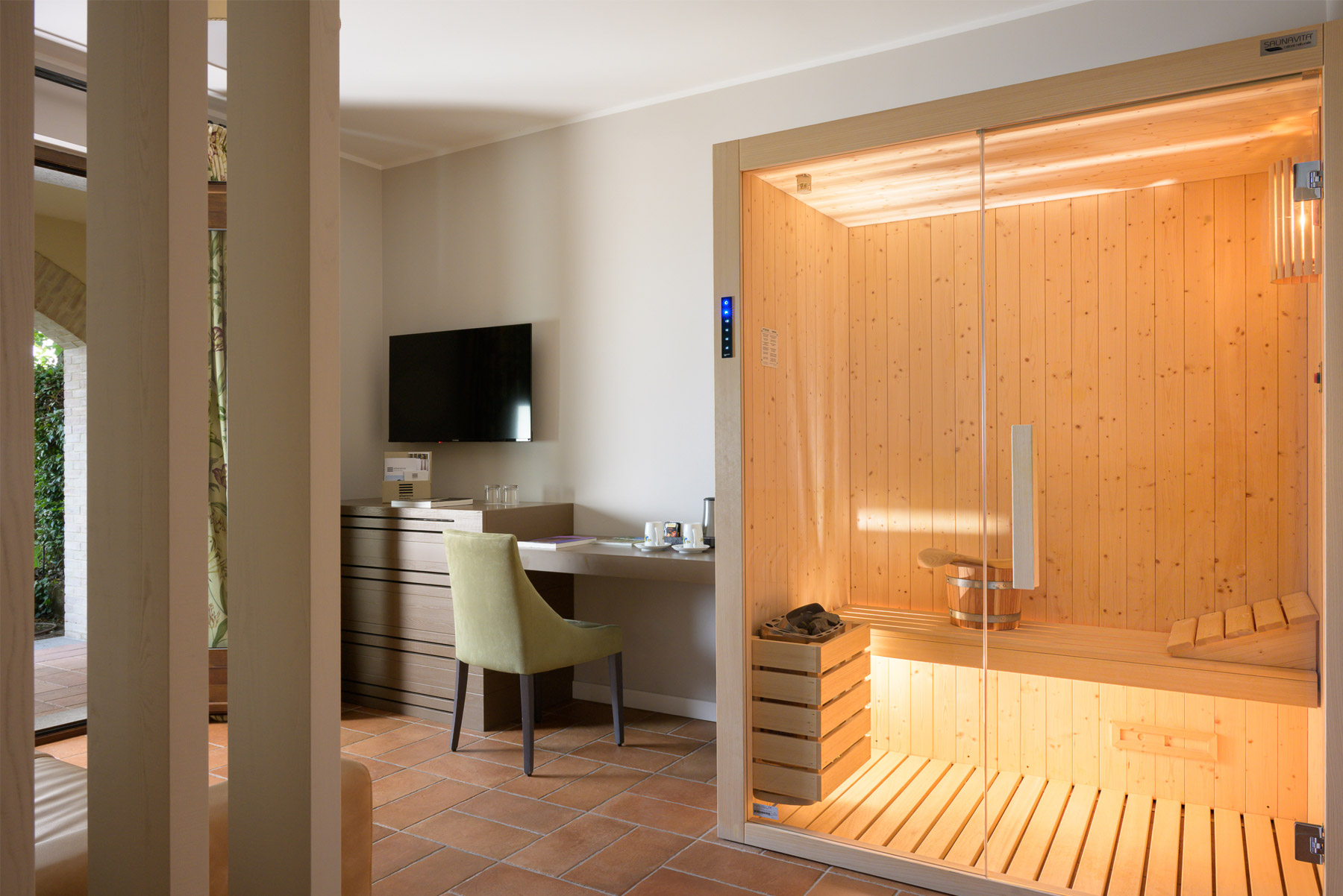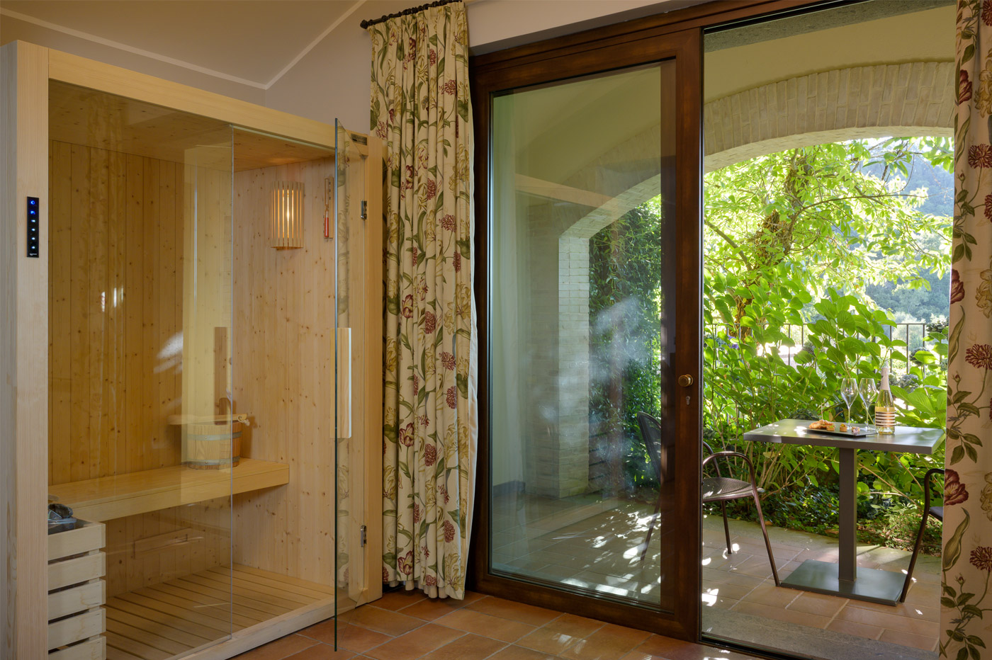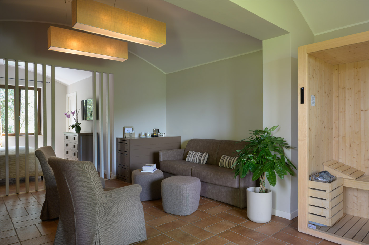 these suites are housed in Borgo del Vino. The dry, enveloping sauna heat will provide relaxing moments for our couples. Furnished in classic style, the floral curtains and wall colors have become synonymous with the Altarocca brand. A private patio with garden furnishings and a sunset view of the vineyards; a large bedroom with a welcoming, King-size bed and a flat-screen TV; a modern bathroom in mosaic with a large shower with intense water pressure, a hairdryer, an organic courtesy set; soft, terrycloth bathrobes, and courtesy slippers. A living room area with a queen-size sofa bed, a second flat-screen TV, a desk, a safe with an electronic combination, a minibar, and a tea corner complete the Queen Wellness Suite.