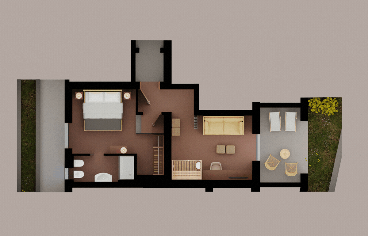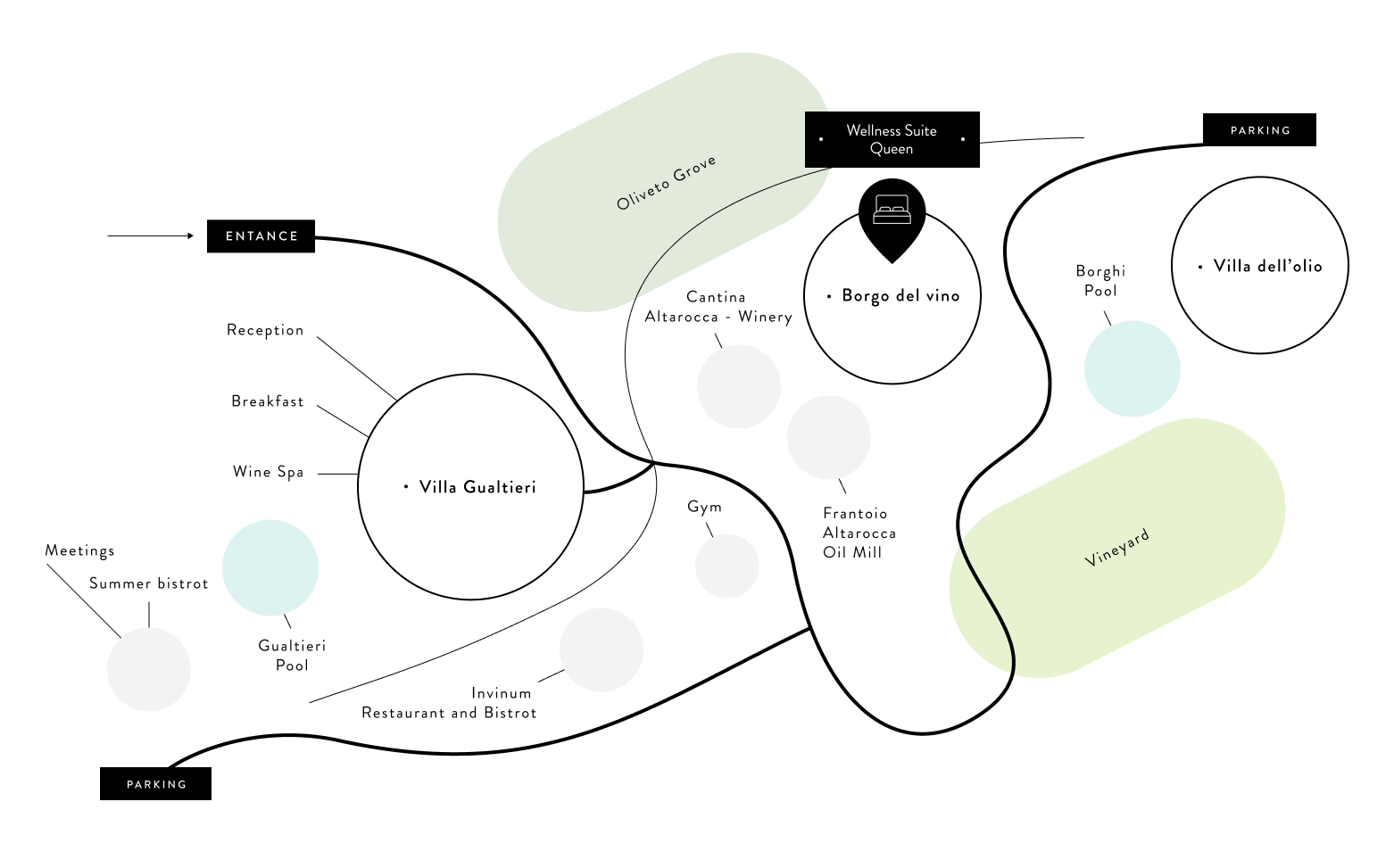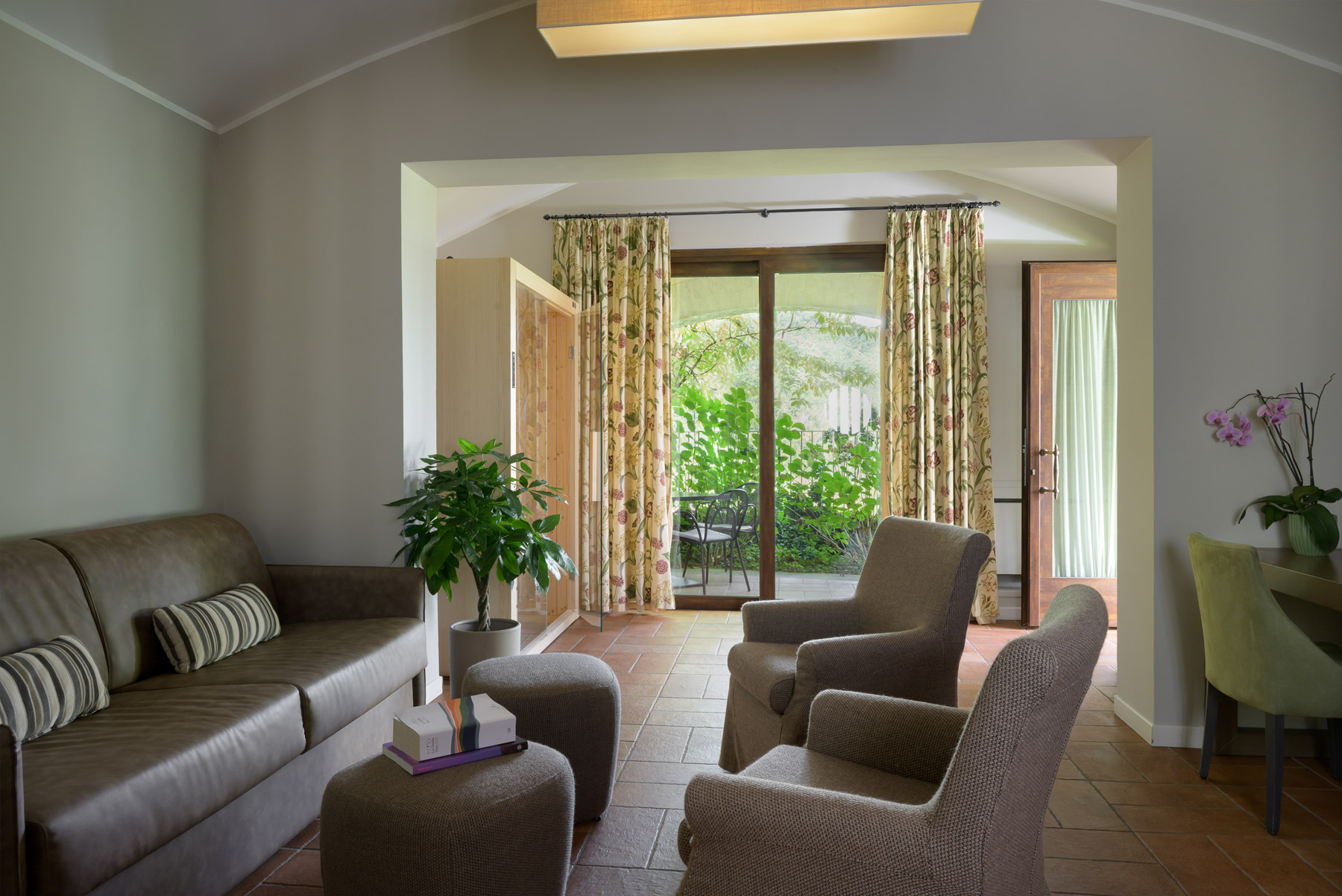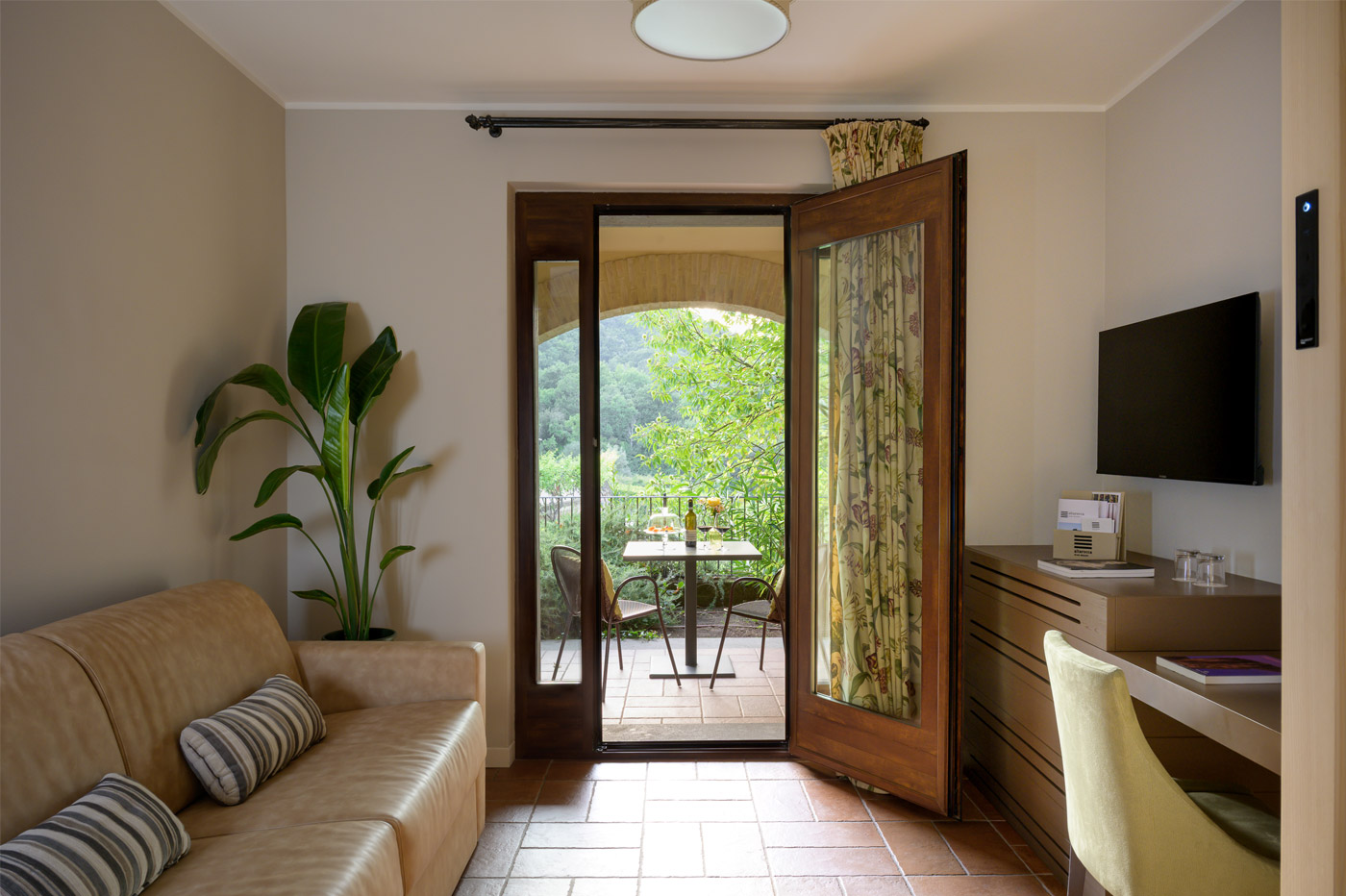 these suites are housed in Borgo del Vino. The dry, enveloping sauna heat will provide relaxing moments for our couples. Furnished in classic style, the floral curtains and wall colors have become synonymous with the Altarocca brand. A private patio with garden furnishings and a sunset view of the vineyards; a large bedroom with a welcoming, King-size bed and a flat-screen TV; a modern bathroom in mosaic with a large shower with intense water pressure, a hairdryer, an organic courtesy set; soft, terrycloth bathrobes, and courtesy slippers. A living room area with a queen-size sofa bed, a second flat-screen TV, a desk, a safe with an electronic combination, a minibar, and a tea corner complete the Queen Wellness Suite.